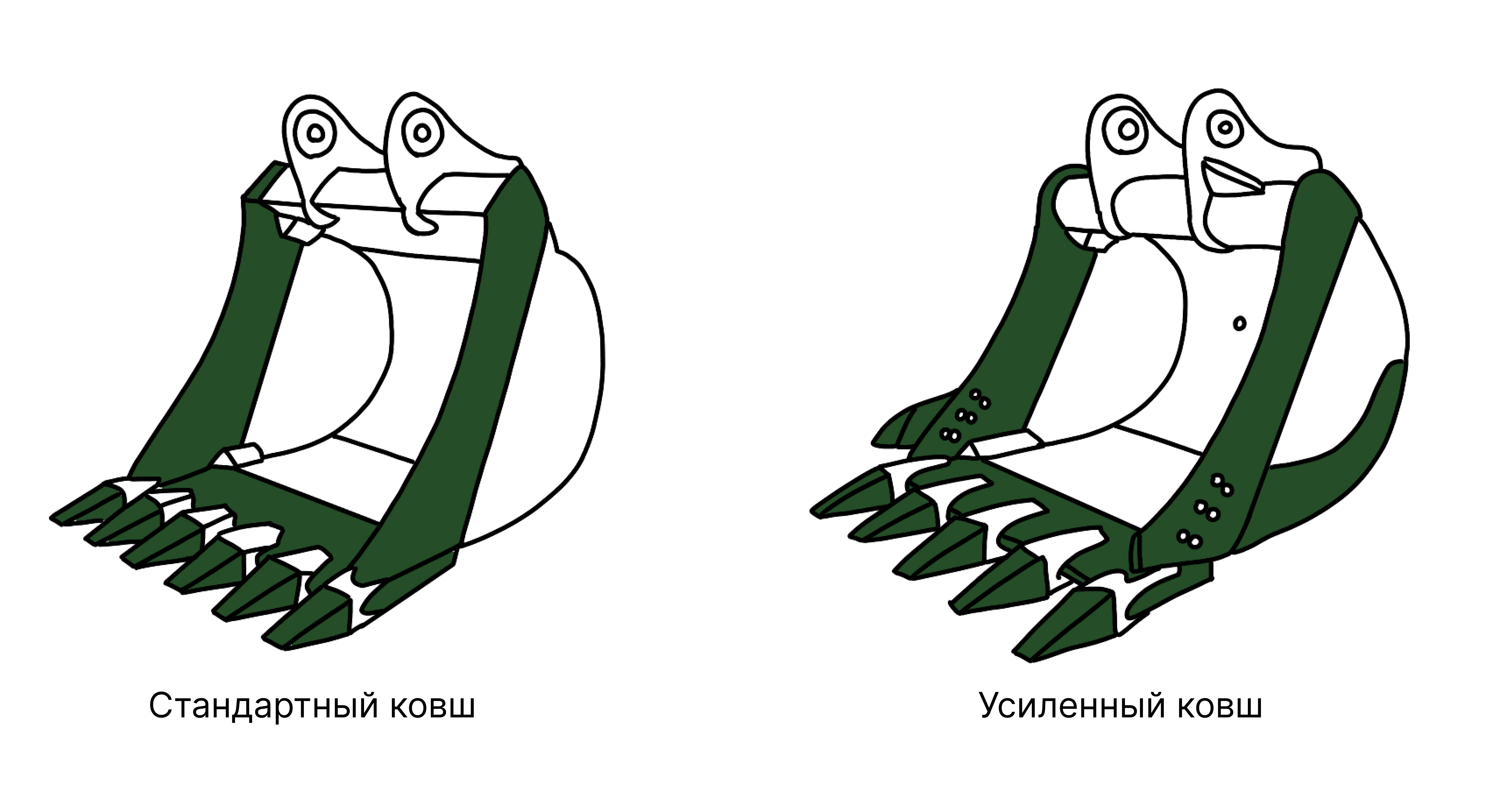 Эти ковши имеют одинаковый объём, но отличаются по массе. Первый — для обычных работ, а второй — для работ с абразивными материалами