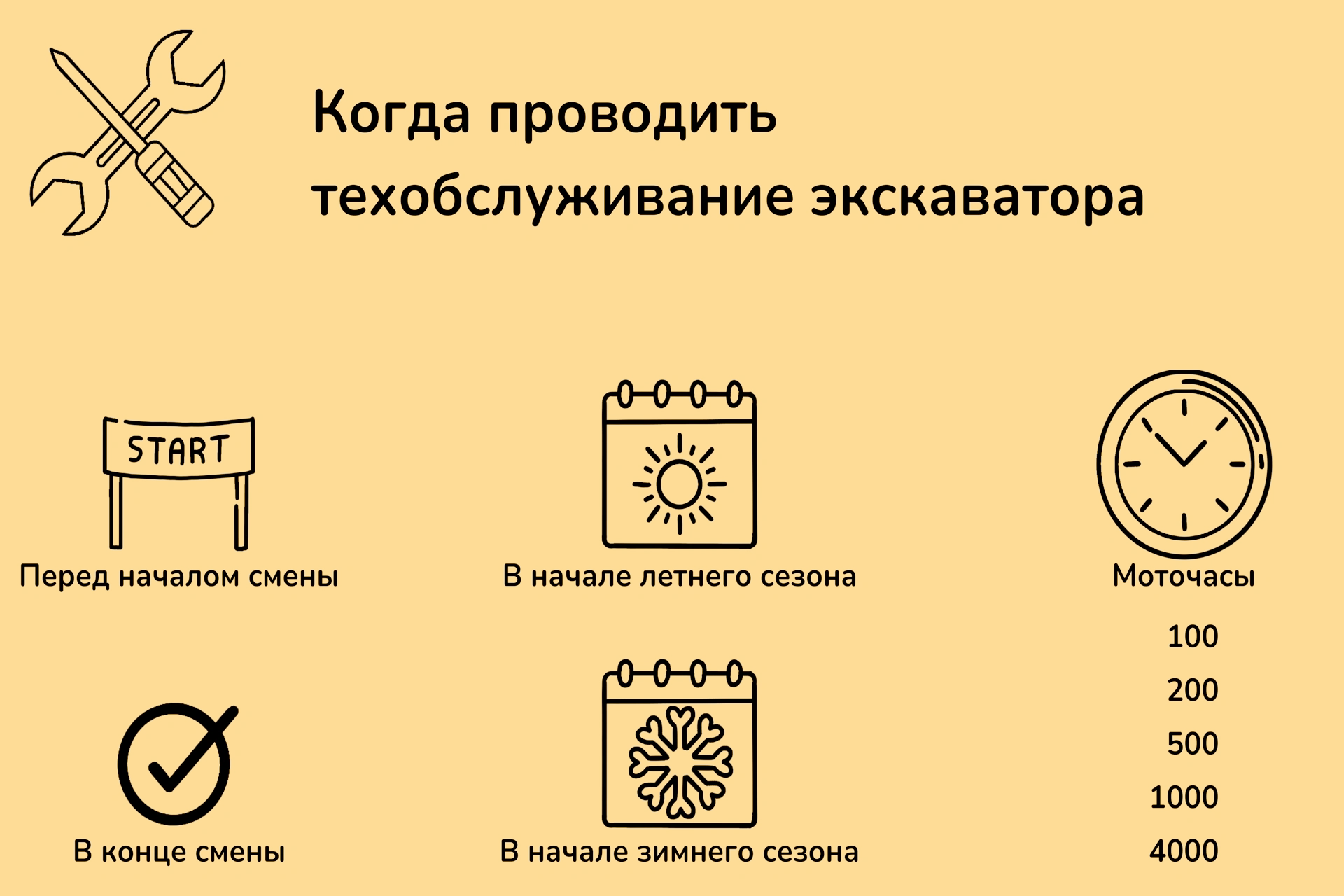В руководствах по эксплуатации приводится детальное описание состава работ и регламент технического обслуживания экскаватора в зависимости от количества моточасов, которые отработал экскаватор. Производители рекомендуют проводить плановое техобслуживание по принципу «на каждом этапе от простой проверки к очистке, регулировке и замене»: