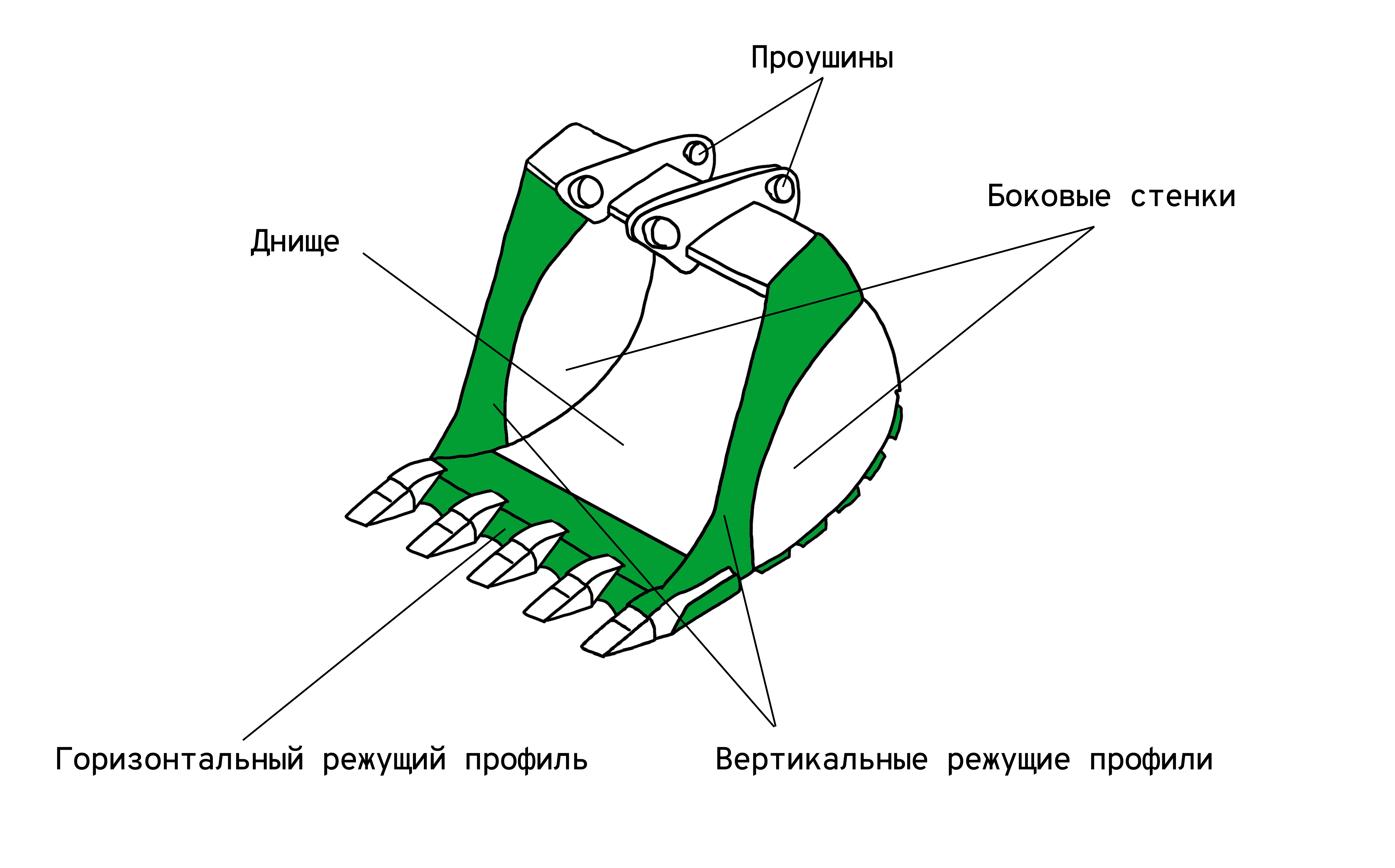 Зеленым цветом на чертеже выделены укреплённые дополнительным металлом места: боковые режущие кромки, горизонтальная кромка и футеровочные пластины снаружи на днище