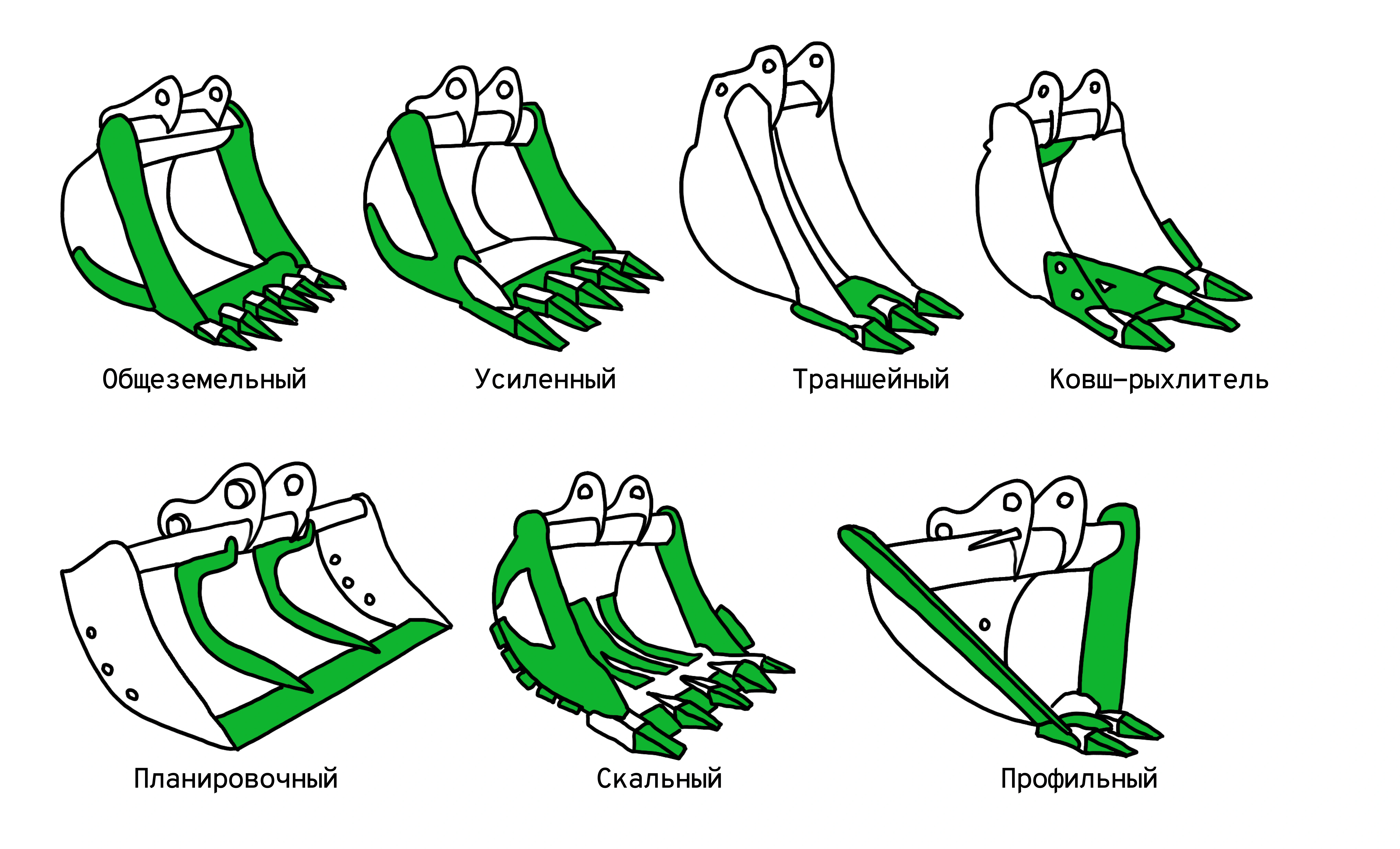Универсальных ковшей не бывает, потому что для каждой задачи нужен свой ковш. Например, для работ с легкими материалами типа угля или торфа подходит стандартный ковш без дополнительных накладок, а для работ с габбро-диабазом или гранитом понадобится усиленный ковш, способный выдержать большие истирающие нагрузки. Ковши различаются по назначению, конструкции и объёму.