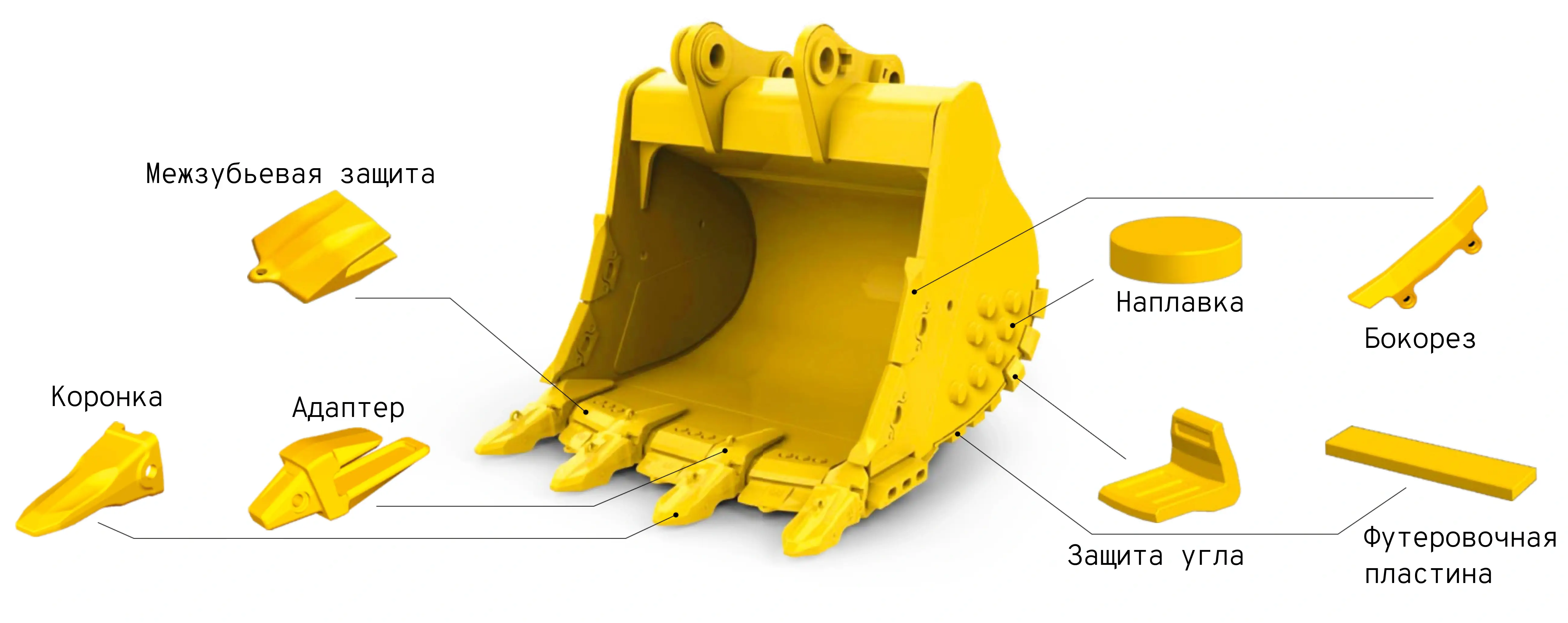 Ковши комплектуются сменными элементами защиты от износа. Адаптеры и коронки — сменные зубья, межзубьевая защита для горизонтальной режущей кромки, наплавки на щёки, бокорезы для защиты вертикальной режущей кромки, футеровочные пластины для защиты днища и «пятки» для защиты углов
