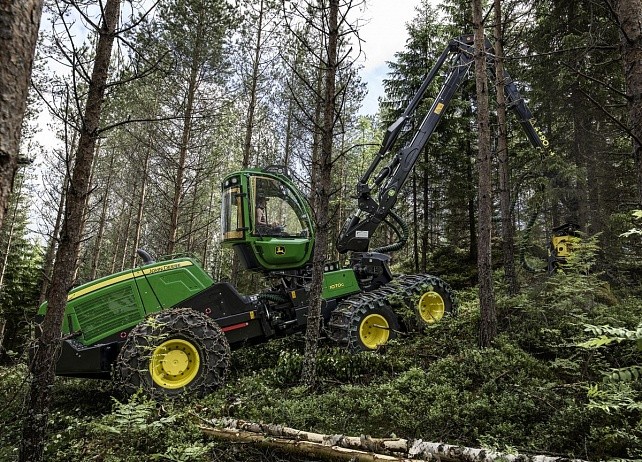 Маневренная и эффективная четырех- или шестиколесная модель John Deere 1070G — прекрасный выбор для проведения работ по прореживанию. Новые блоки управления позволили упростить электрическую систему. Высокая производительность новых блоков также значительно повысила точность управления движениями манипулятора. Двигатель, насосы, радиаторы и баки развернуты на 180° относительно классической компоновки для уменьшения высоты капота и улучшения обзорности. Уровень шума в кабине значительно снижен благодаря расположению радиаторов в задней части машины.