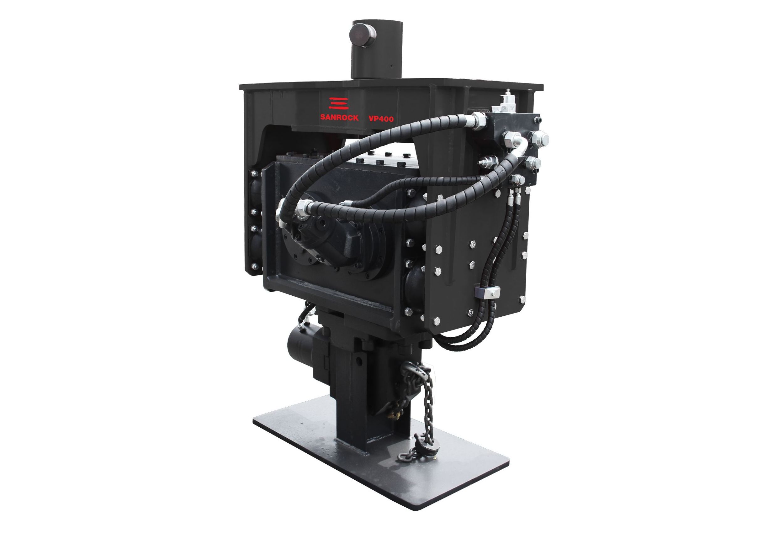 Вибропрогружатель Sanrock VP400 — навесное оборудование, предназначенное для погружения железобетонных столбов, свай, колодцев в самые разнообразные грунты.