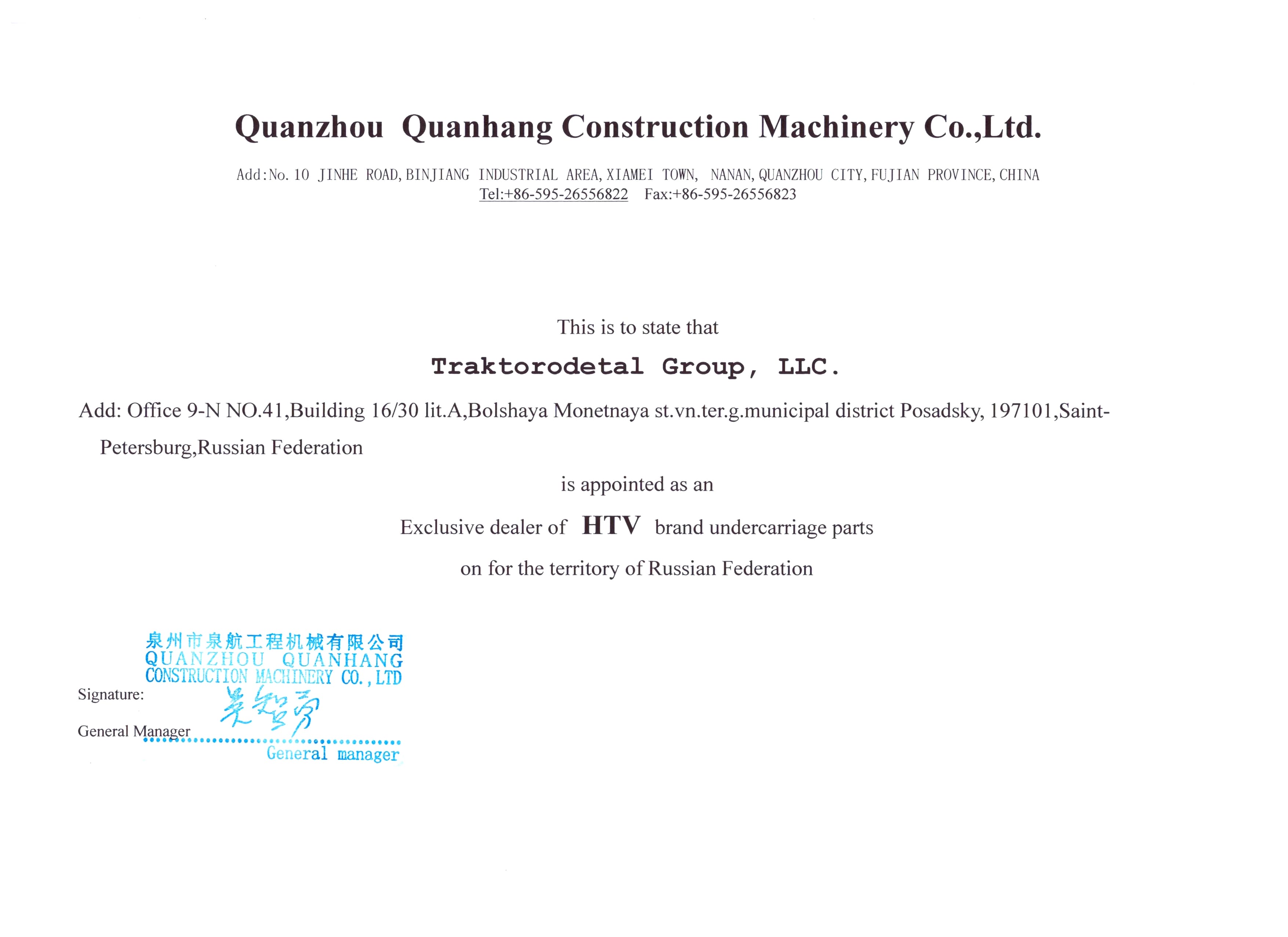 HTV– китайское предприятие, специализирующееся на изготовлении компонентов ходовых систем, опорных катков, поддерживающих катков, направляющих колес, ведущих колес, для гусеничных экскаваторов и прочих машин. Ассортимент выпускаемой продукции очень широкий. Компания Трактородеталь имеет эксклюзивные права по продаже продукции под брендом HTV на территории Российской Федерации.